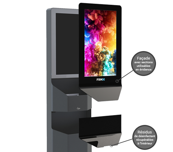 Le cadre en aluminium de la SND Pro de Frmx™ n’est pas encombrant et offre un grand espace sur 180° degrés pour se désinfecter les mains. Sa façade de couleurs différentes au niveau de l’écran et du distributeur automatique met en avant son espace d’utilisation ainsi que son aspect professionnel et futuriste. De plus, il récupère les résidus de liquide désinfectant et évite les déversements au sol.